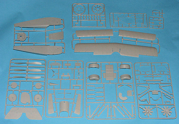 There are nine sprues of various sizes for this kit and as you can see, there are bits that will not be used on this particular version. The molding is quite good though I did find a couple of small sink areas on the fuselage opposite some interior detailing. There isn't much in the way of optional pieces at all, in fact I could find none. I did find that a couple of the parts had to be folded or bent in order to be used. The seat back has to be curved into shape and what I assume is a fuel tank or ammo bin has to be folded prior to gluing. Thanks to the somewhat soft plastic, this should not be a problem.