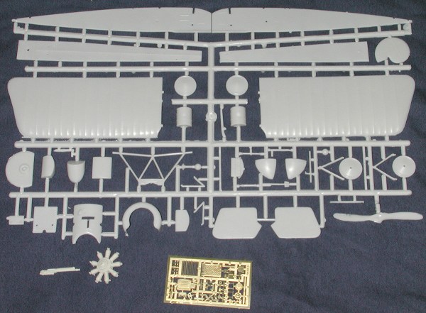 The kit itself is but a single, very large sprue. The flight surfaces are all a single piece. Surface of the plastic is a bit rough, but nothing like the pits I've experienced with FM and Hi Tech kits; more like Mach II. There is really little flash, which is a big surprise, though all of the parts will require some clean up. The sprue gates are also a bit large so a razor saw is a requirement. What I did find is that there are a mass of ejector towers or ejector pin marks on nearly every part. The lower side of the wings is rife with the small towers and the fuselage interiors (which have nice framework molded inside) has a plethora of these towers will need removed. The box top states that this is a kit for experienced builders and that should be taken to heart.