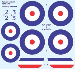 The decal sheet provides the insignia and rudder markings; the builder will have to duplicate the rest of the paint scheme, a task that will require some artistic abilities and the use of a lot of masking tape. Roden decals are well printed in the proper colors, but have a reputation for being somewhat difficult to work with. I've found some success using hot water and others have found that floating the decal is a thinned mixture of Future or other acrylic clear is most helpful in getting them to provide the proper results.