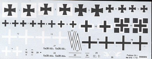Instructions are more than adequate and include six different aircraft, including one flown by the Red Baron. There are several in overall colors and several in the streaky green fabric that was so common with the Dr.I The decals themselves are very thin and well printed, though they are basically just black and white. As you can see, there are a multiplicity of insignia markings to use. If they don't work well, there are a number of aftermarket decals available for the 1/72 Fokker Dr.I.