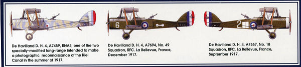 During 1917 D.H.4s of various types were widely used in the skies of the Western Front, and even the arrival of the more modern D.H.9 did not end its career, because this successor appeared to be unsuccessful and was soon withdrawn from operations. And only the appearance of D.H.9A in 1918 pushed these machines into the background. They were gradually taken off from the front line, and passed on to training and patrol units. Many machines were sent to the British colonies, mainly to the Near East, to India and South Africa. There they were used until the mid 1920's, when they were exchanged for other types, mainly the Bristol F.2B Fighter