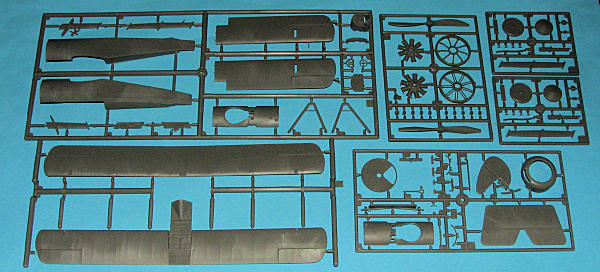 Of the six sprues, one for various struts and wheels is duplicated. The engine is nicely molded with separate cylinder heads. A well molded intake and pushrod piece add to the detail level. There are optional propellers; one with squared off tips. The only other option I can see is between a one and two gun armament, with separate upper forward fuselage sections. The fabric effect on all the various surfaces is properly subdued and looks very realistic.