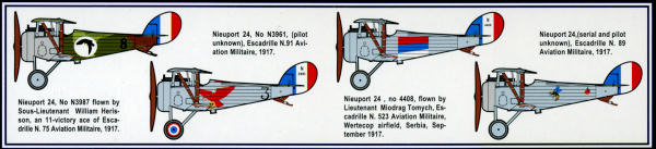 In the summer of 1917, when the Nieuport 24 and 24bis. were coming off the production line, most French fighter squadrons were replacing their Nieuport 17s with SPAD S.VIIs – and many of the new fighters went to fighter training schools, and to France’s allies, including the Russians, and the British, who used theirs well into 1918, due to a shortage of S.E.5as. A few French units retained the Nieuport through late 1917 – the type was actually preferred by some pilots, especially the famous Charles Nungesser.