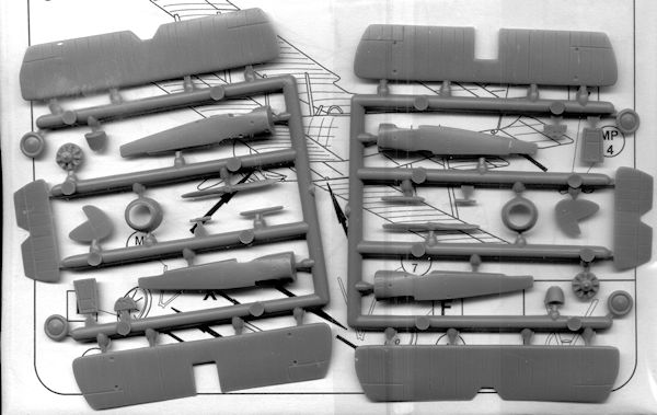 The plastic bits include the fuselage halves, a complete upper and lower wing, full tailplanes and fin/rudder. The engine is molded onto a firewall which fits into a one-piece engine cowling. The interior consists of a floor, seat and instrument panel.