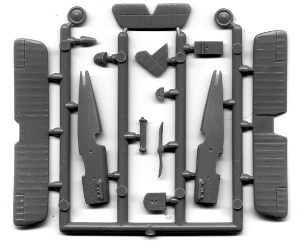 The plastic bits include the fuselage halves, a complete upper and lower wing, full tailplanes and fin/rudder. The kit includes a separate front piece for the engine cowling. The interior consists of a floor, seat and instrument panel.