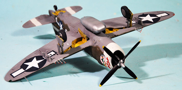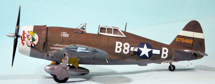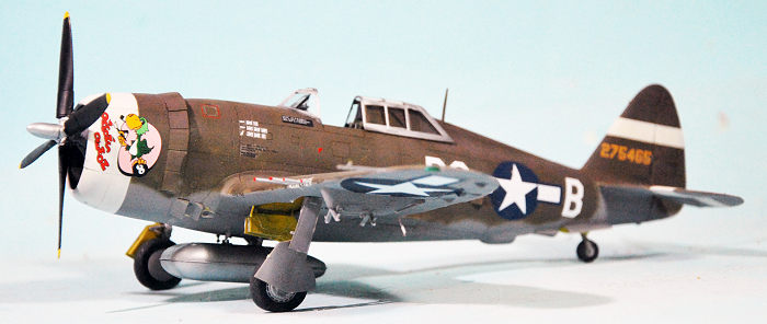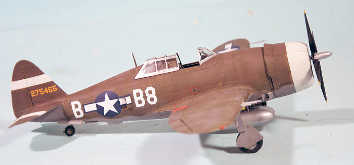 I attached the landing gear and prop, and unmasked the caopy parts and attached them. I then declared victory and put the model on the P-47 shelves.