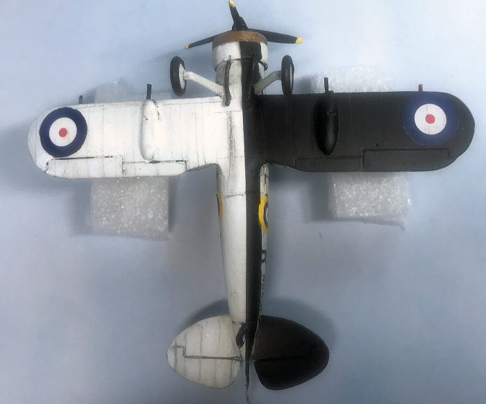 When all was done topsides, I covered the paint again with Tamiya flat, then masked everything to airbrush the undersides in the Gladiator’s fascinating half black, half white scheme. The front of the cowling got Testors Brass brushed on, right out of the square bottles of my misspent, geeky youth.