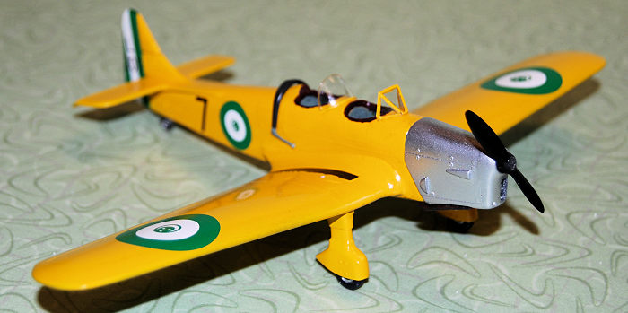 Were I to do it again, I would have drilled out two small holes in the appropriate spot with a pinvise and slipped in a piece of music wire just long enough to barely protrude from either side to serve as an attachment point. It was done, though, and I now had two very eye-catching Miles Magisters in 1/48 scale.