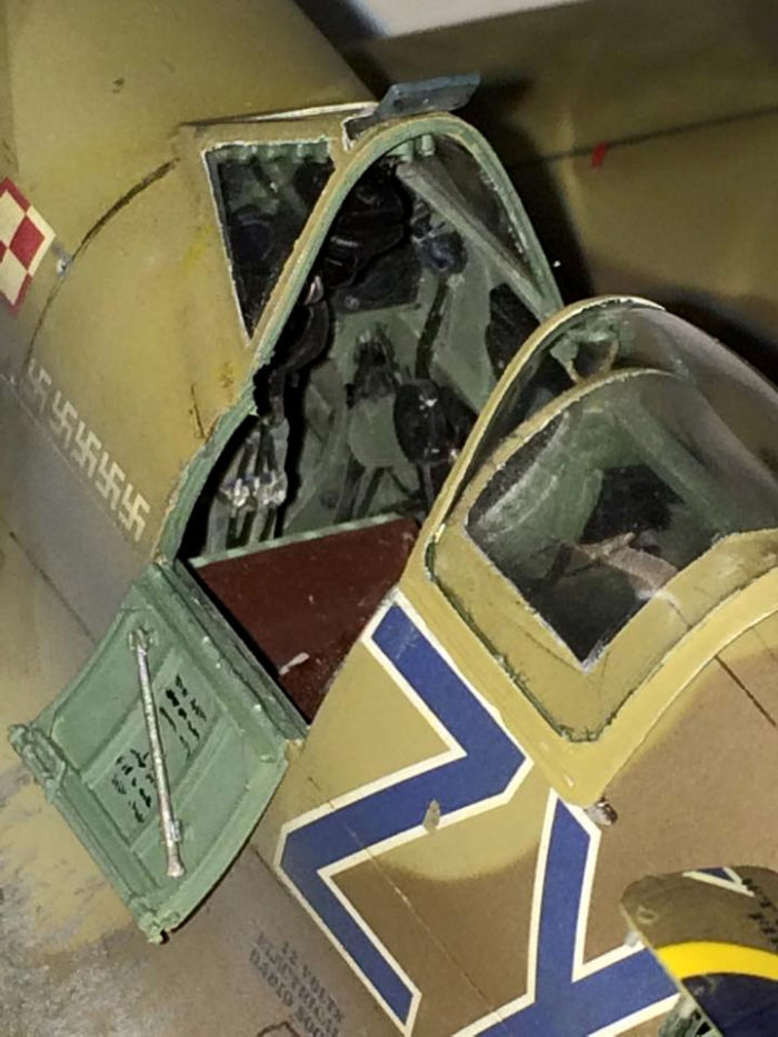 The canopy hood had been masked inside and out and sprayed with RAF interior green and outside with the appropriate camo color.