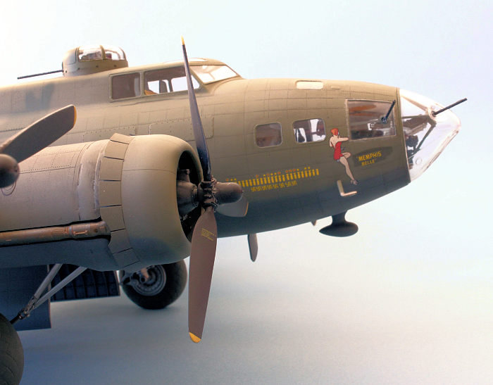 The propellers were made to look worn by lightly spraying aluminum on the back side of each blade to depict the sandblasted effect seen on operational aircraft. I noticed in photos of Memphis Belle that two of the four props had blades without the Hamilton Standard logos stickers. The leading edges of the blades were dabbed with a silver colored pencil in random spots to depict paint chipping.