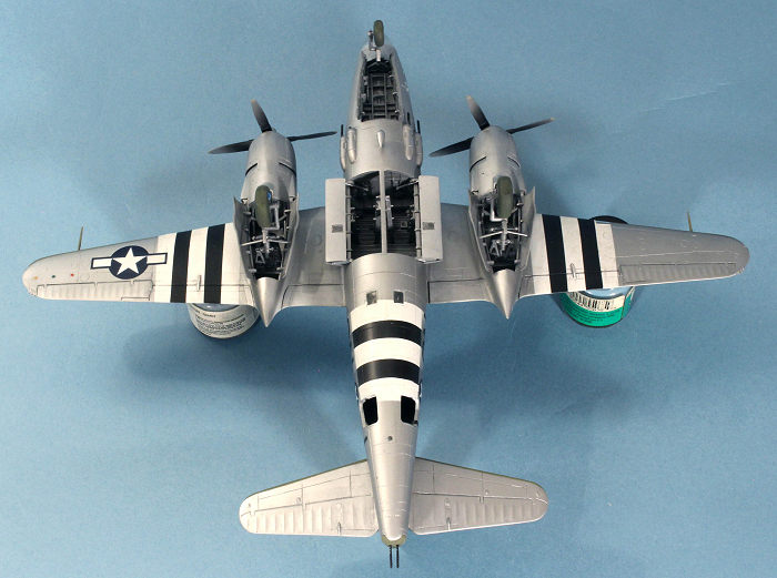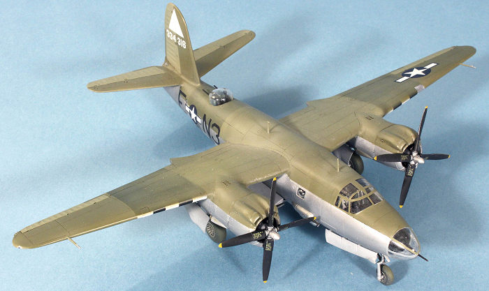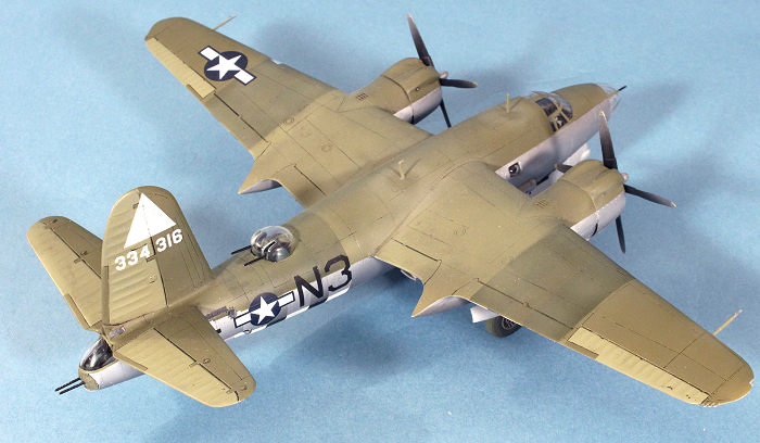 D-Day stripes went all on 9th Air Force Marauders on the evening of June 4, 1944, and were ordered removed from the topsides by the end of August. For B-26s in overall aluminum, the paint for the stripes was removed with aviation gas and a lot of elbow grease from the ground crews. For those aircraft with camouflage paint on the topsides, it appears that the stripes were just sprayed over with fresh Olive Drab or RAF Dark Green paint, depending on the squadron. I masked off the stripes for both top and bottom surfaces, using Testors Acryl Flat White and Vallejo Flat Black, then went back over the stripes on the top of the wings and the fuselage with Olive Drab straight from the bottle but sprayed thinly enough to let some of the underlying stripe definition to show through.