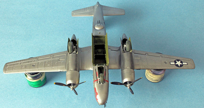 The bomb bay is detailed with eight 250 LB bombs provided. The bomb bay doors can be posed open or closed. Some features from the initial 2004 release of this kit as a B-26K variant have to be removed, such as the wing leading-edge wing machine gun barrels. Also, vortex generators on the right side of the vertical stabilizer need to be sliced off.
