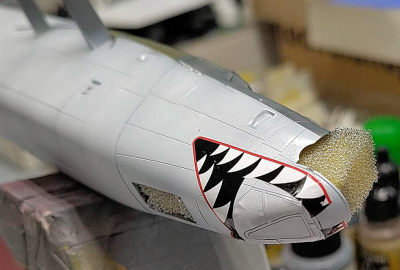 Well, let me make a confession first. I found a reference image of this exact plane after I had the decals and started the build. On it you can clearly see that the sharkmouth was only part of an elaborate nose art, with a large yellow area and stylized eyes and in fact a head of some mythical toothy creature. As Rowan Atkinson would have said in „Loce Actually“ – „This is so much more than a sharkmouth“. It wasn´t part of the decal sheet, and that got me thinking.