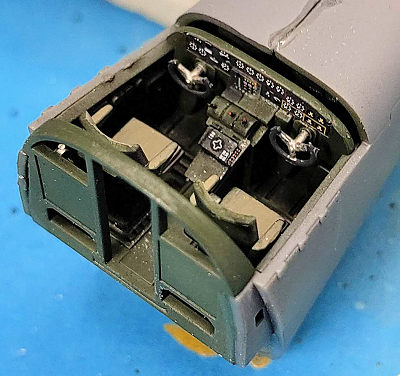 After the usual (for me) filling and sanding and checking and redoing, I was ready to mate the fore and the main fuselage. That went well, and needed virtually no seamwork. I was soon able to mask the front transparencies, and the New Ware masks worked very nicely. Having added the transparencies (which fit very, very well) to the fuselage, I filled the very small seams simply with Future. Not too long after, I had the fuselage openings protected with pieces of foam and primed the fuselage in total. I needed to redo the areas where I had blanked off the turret openings, filling with CA, and then sanding and priming and rechecking.