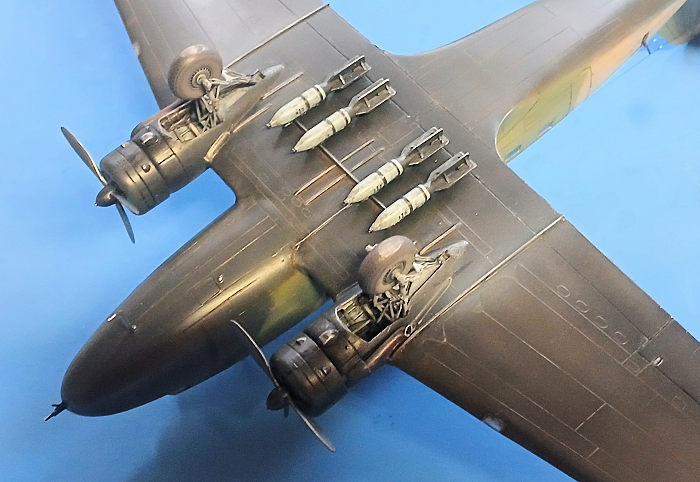 A wash of dark grays and brown went over the airframe, followed by a semigloss coat and highlighting, pastels, with other assorted weathering. This was locked under a final semigloss coat, the bombs, propellers, antenna aerials, and turret added, and that was it.