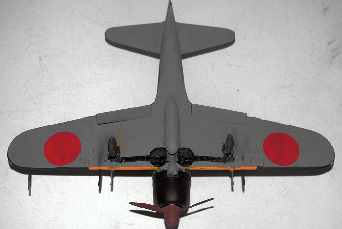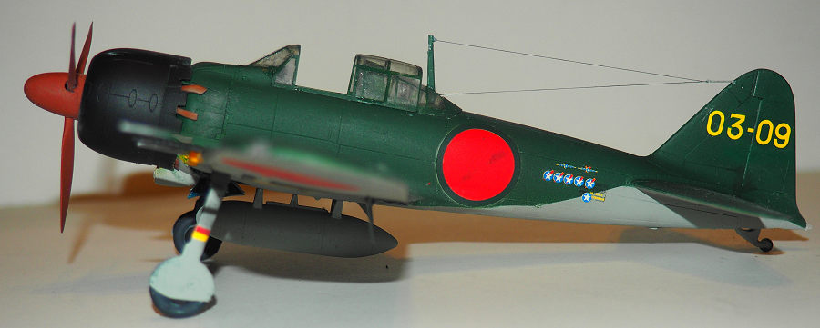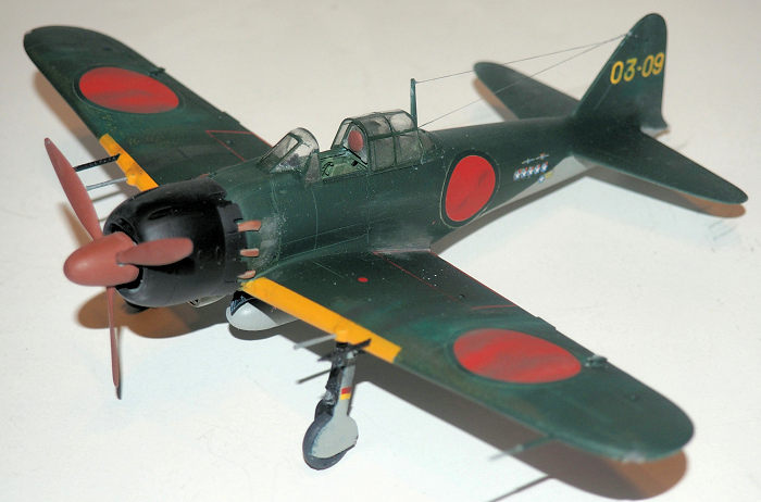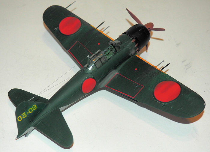 Paints used: Tamiya AS-2 Light Gray IJN spray, AS-21 Dark Green 2 IJN spray, TS-29 Semi-gloss black for cowling, and TS-47 Chrome Yellow spray for the leading wing edges.