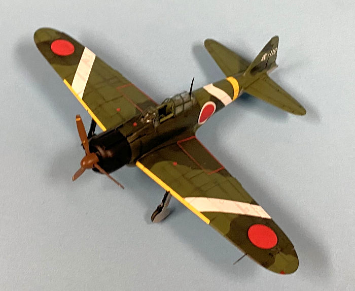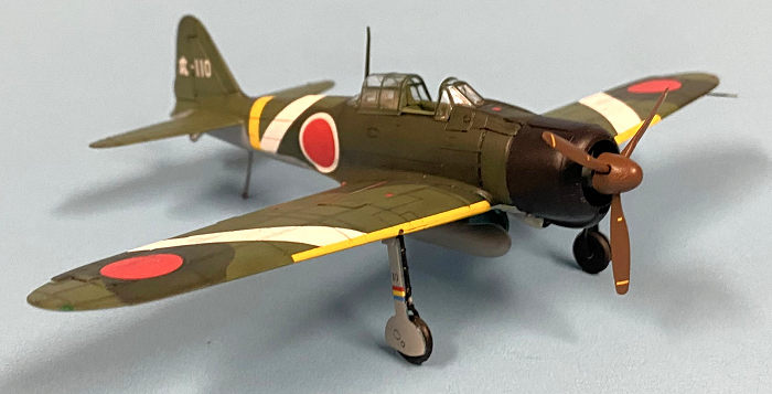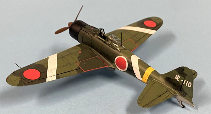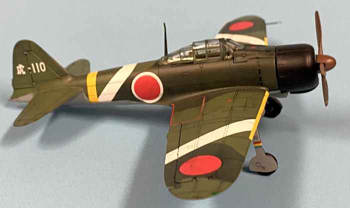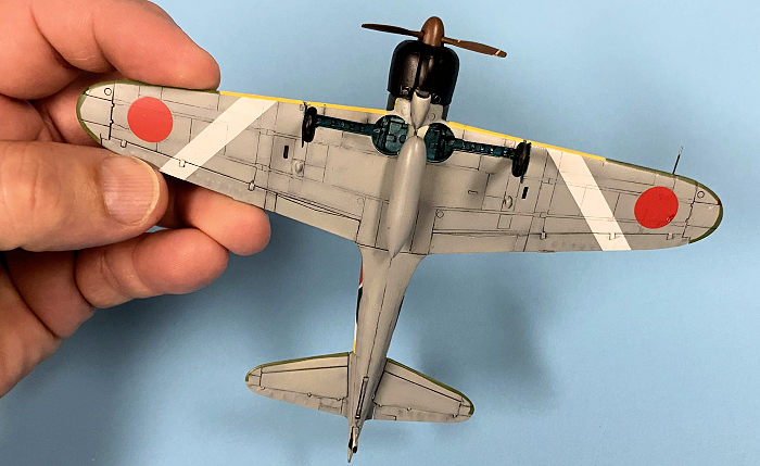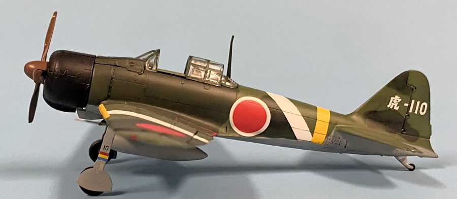 With a few areas needing a bit of paint to cover the flash removal and the minimal sanding, I decide to completely paint the model. The pre-painted surface had a satin/flat finish and figured the existing colour scheme did provide a decent enough base coat. I decided that no primer would be required but did use some thinned out Tamiya Flat Black to preshade the panel lines. Looking through my stash of decals and other Zero kits, I decided to give the aircraft a more colourful appearance and focused on finishing it as Tiger-110 from the 261st Kokutia. I did have TechMod decals #72041 and I also had kit decals from Hasegawa #00451 for this chosen scheme. The camo scheme has been described and interpreted in several colours, heck there’s even differences between the paint schemes from TechMod and Hasegawa. There also was what I call a ‘red-tail demon’ scheme with red rear fuselage and tail, but I might actually try that scheme for a project at a later date.