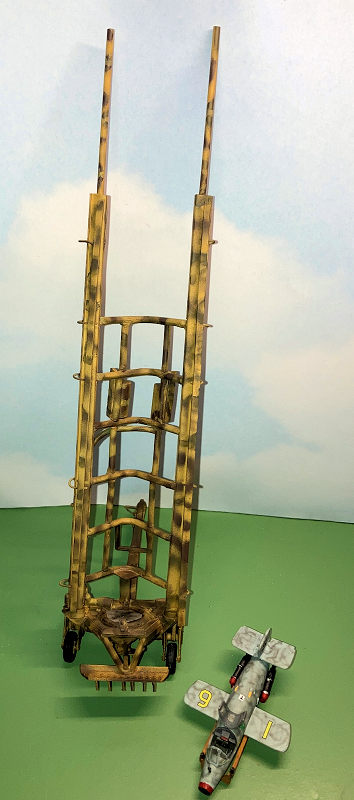 Finding myself with the trolley for a different "whiffer," a He-162 / Mistel combo from Dragon, I thought about how a launcher might have been fabricated to hide a Natter in deep shelters, such as von Braun’s infamous V-2 factory's caves in the Harz Mountains. The rocket interceptor would be hauled out, the launcher stood up, and if the Natter did not explode from its volatile fuel combination, rocketed into the bomber streams making the rubble bounce in Germany.