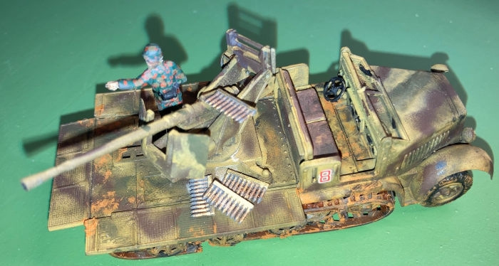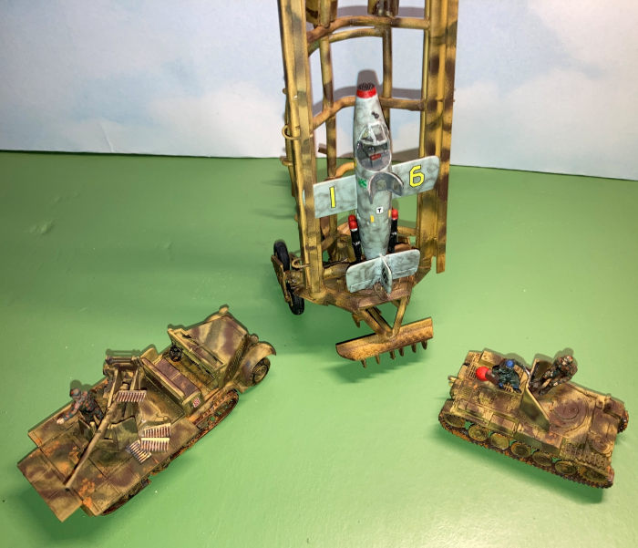 The vehicles got late-war camo airbrushed with Vallejo Air paints, then some weathering of mud and grime. They’d be outside more than the launcher itself.