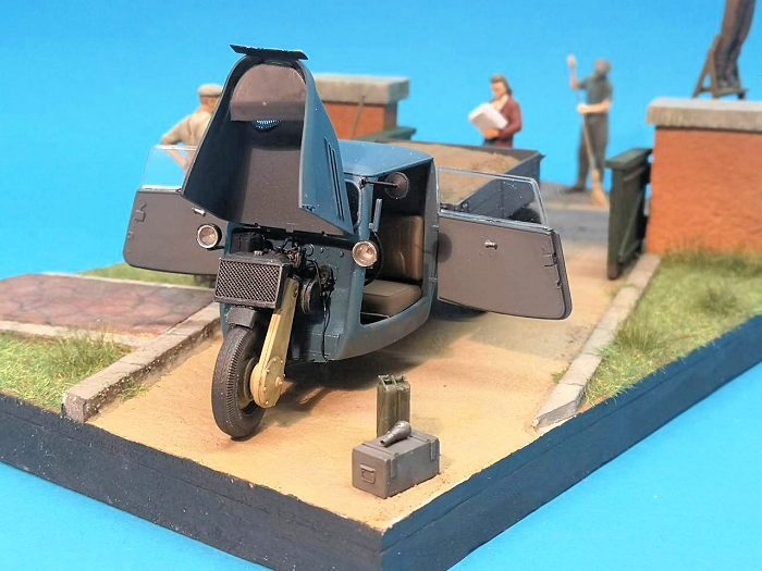 Once that was all achieved (very carefully!) I was able to add the (not that small number of) remaining fiddly bits, including the doors and the hood. Once all the numberplates, wing mirrors, indicators and so on had been added, I allowed myself a heartfelt sigh that I had completed this kit.