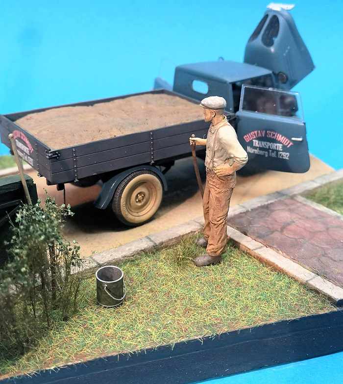 Soon the question of figures turned up, and originally it was to be just the one. The vehicle´s driver, holding a shovel/spade and thinking about what to do next. I found a fine 3D printed figure at www.sockelshop.de of their own label Modern Armies In Miniature, and got that plus some paraphernalia.