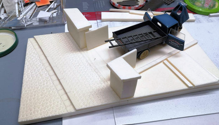 So piece by piece the simple base grew and escalated. I enjoyed cutting and texturing the foam, and gradually arriving at a design I liked. Somewhere along the way I decided not to use the kit cargo, but to make a piece of foam that looked as if the flatbed was loaded with manure or soil. Preferably something not too heavy for the vehicle´s capacity, BTW.
