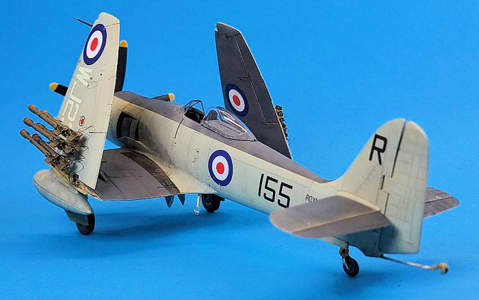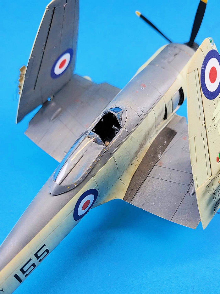 On the final stretch, I added the gunsight, which sadly fitted too low in my opinion, but there was nothing I saw I could do. Then came the canopies, using flat-curing white glue Bindan RS. The front part fit exceedingly well into a recess in the fuselage – cleverly done, Airfix! After the outer wings had been added and the glue had cured, I tried my hand at the connecting cables visible in the wingfold area. That proved to be as iffy as expected, but worked out with a mix of Eduard PE and wire. Having painted and flatcoated these and other critical areas, I declared the project complete and turned to taking photographs.