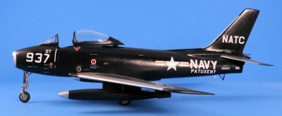 For all of the kit’s faults, it really looks good in the white NATC markings over dark sea blue. Placed next to the FJ-1, the contrast in shape and form is so great that they really should have been the FJ-1 and the F2J-1, but I’m sure that the Navy’s decision not to do this was more political/funding issues rather than design.