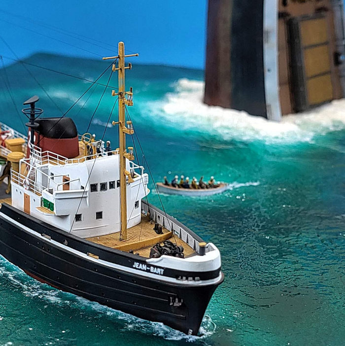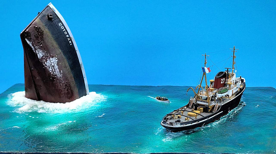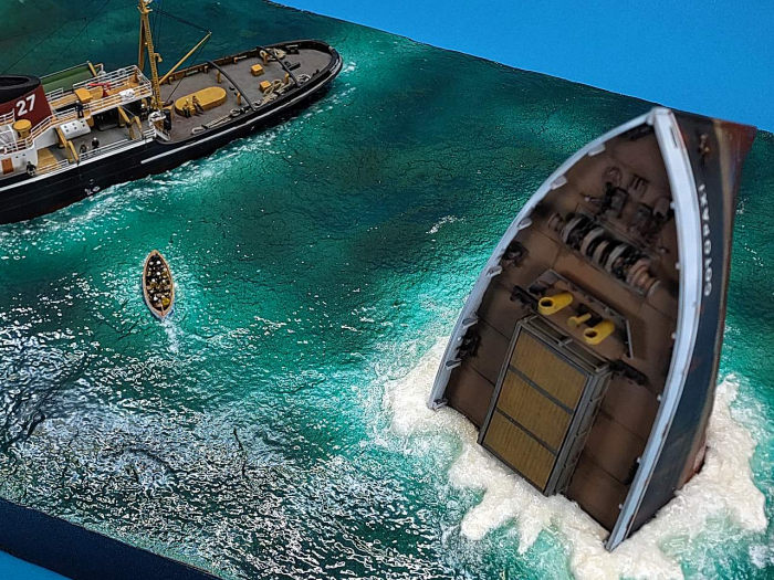 I then placed the three models (wreck, lifeboat and tug) onto the base, only the lifeboat needed blending in with acrylic gel. The remaining gaps around the tug are mostly hidden under the stern hull overhang.