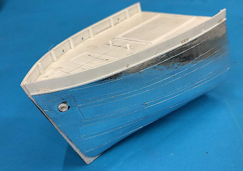 Having blended in the hull with the bulwark using more putty and PVA glue, I then started sheathing the hull with sections of thin self-adhesive aluminum foil. I tried to simulate riveting with a riveting wheel, but that did not look right to me, so I redid the whole process.