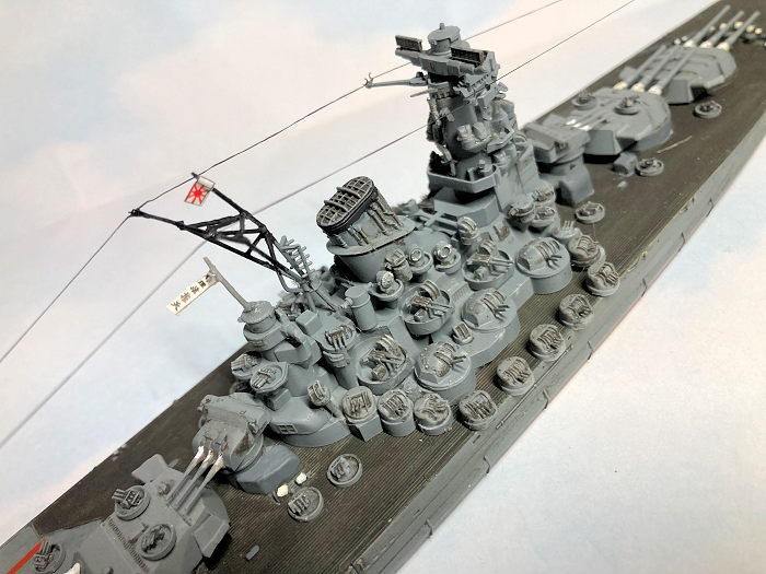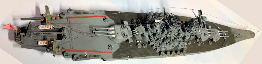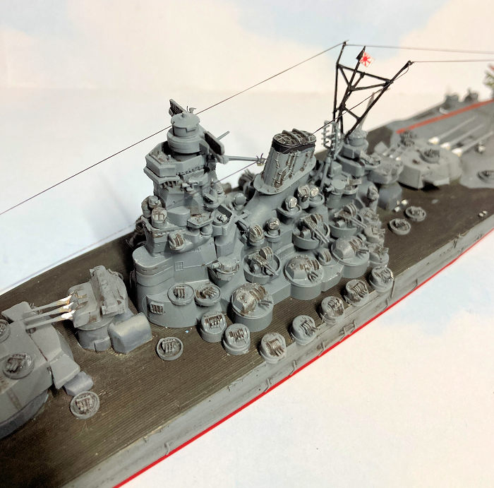 I planned to show Yamato late-war but just before her death-ride to Okinawa. I wanted ship’s boats and aircraft present and not the ugly and rather desperate sandbags piled around the triple-machinegun installations on deck and atop two of the turrets.