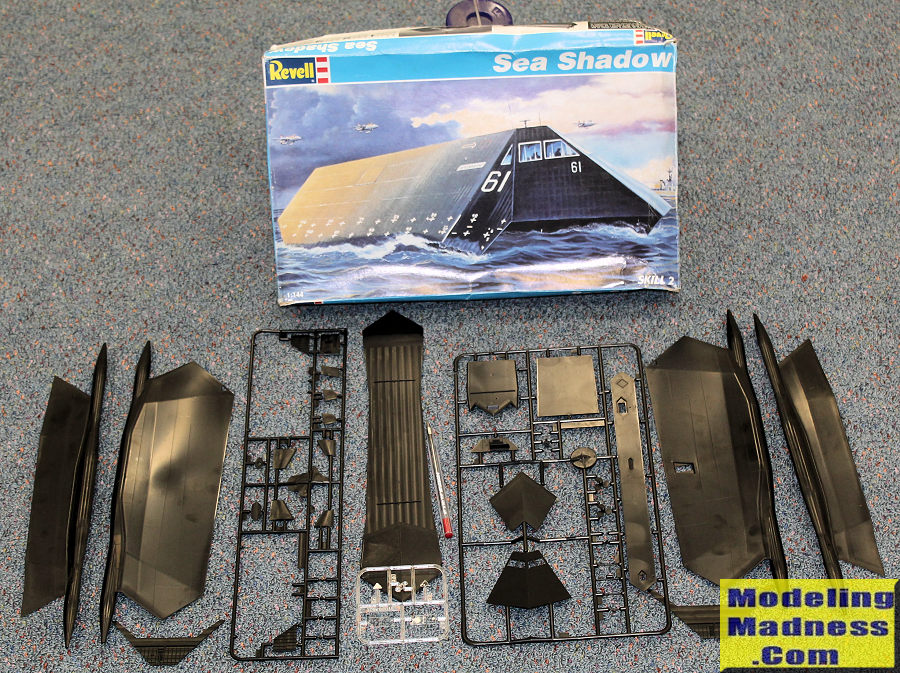I bought this kit many years ago, though I can’t recall from where. It musta’ been cheap because the box was crushed, and the decals were gone, but all of the plastic was still inside the sealed bag. Scalemates advises that it was released in 1995/96 before production ceased. Other sources show that the missing decal sheet is large with the calibration markings as shown on the boxart. The kit comes in a 15”x9” lid-&-tray box with a single bag that holds four black sprues of 40 parts (some very large and some very small), and a small sprue of 7 small flat clear parts. Details vary from very-fine raised panel lines to large cast-on blocks. The instruction sheet shows 13 assembly steps with progressive internal detail painting directions (but will it be seen?). Externally, Sea Shadow is flat black, which will play havoc with the large mostly-clear decals (shown on the 6 decal-placement views). There are a few splashes of colour – in the cockpit/bridge and external extended sensors (that may be left-off = in a retracted position).