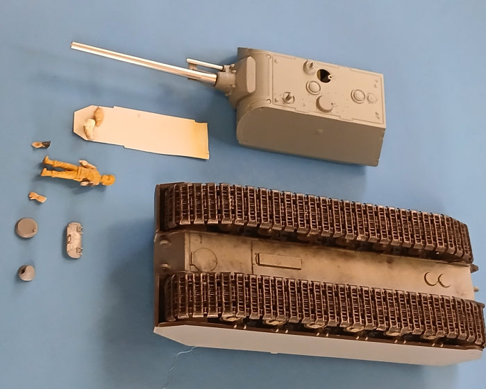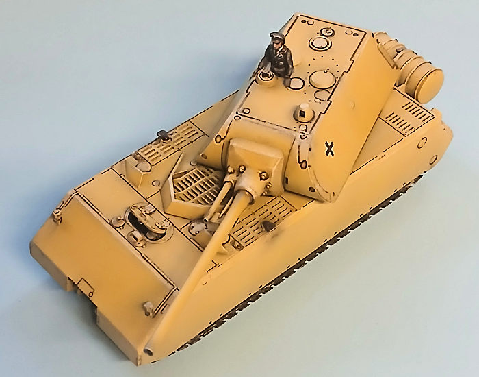 Remaining assembly was totally straightforward, my only deviations from the sequence being to assemble the hull top (C1) and its photoetch screens to the rest of the hull before attaching the little parts. Be sure to get the gun mount (E2) the right side up and to let it cure thoroughly before assembling the rest of the turret and mounting the gun. On a whim, I retrieved some old Esci panzer crew figures from the spares bin and adapted them to the vehicle: a commander in his post up top and two bust figures just visible in the slightly-open hull hatch.