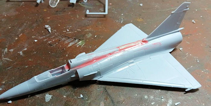 I started by carefully sawing off the top spine, up to the point that it meets the fin. I then reattached the sawn spine forward, just aft of the cockpit. This was not easy, as the spine was barely touching the wider cutout openings and I used liquefied styrene to build up a solid joint.