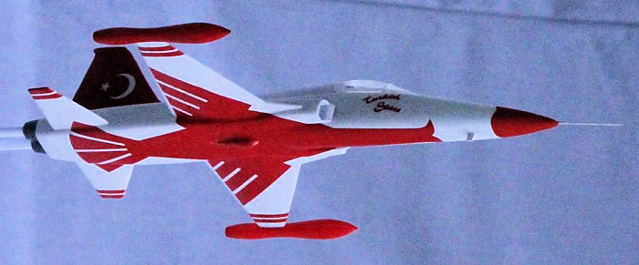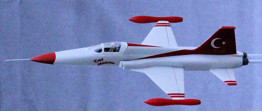 Internet shows several liveries for the Turkish Stars / the Türk Yildizlari, but this one will do me. And what will I do with a spare F-5 with no tip tanks? Maybe I’ll turn it into a Mig.28 from the movie ‘Top Gun” with wingtip Sidewinder air-to-air missiles, IF I can get suitable decals for it!! Can anyone beat a 15-year build?
