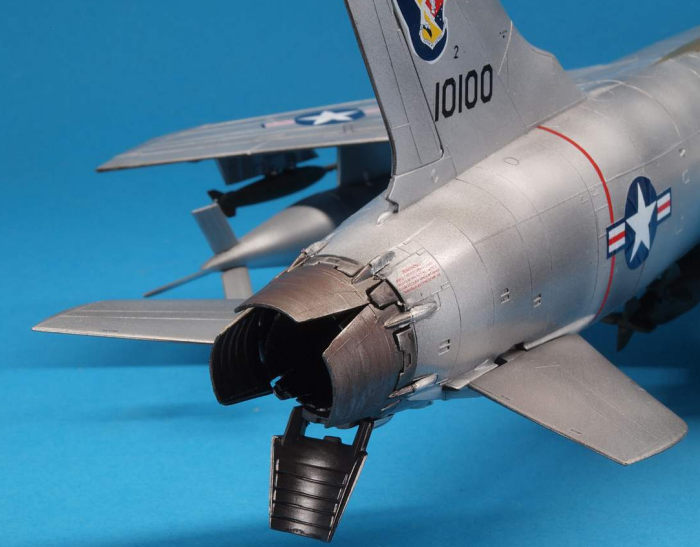 I also added the very tricky and flimsy exhaust assembly, and was glad it fit so well. But once I had added the four speed brakes, I realized all that effort had been for nought. You can´t see any of it unless you intrude upon the model with a penlight and malice. Lesson learned. A) I was able to just about assemble this, um, nice assortment of PE. B) I shouldn´t have bothered with it.