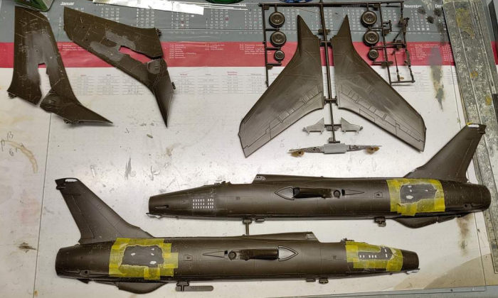 At that point, I shared some of my in-progress images with our forum here at M2. Ben Brown, who is rather interested and knowledgeable re the Thud, told me I needed to remove yet more molded-on details relating to the G-model, as in the wingtip bulges and the larger fairing on the tail fin which protrudes behind the trailing edge. Thank you, Ben! Remove the bulges I did, the same morning I sprayed the masked canopy parts first primer grey, then yellow on the uppersides, for the insulation/seal (?) surrounding each pane. Next came quite some time of attending to the fuselage seams, and with the remainder of the subassemblies mostly done, there was no use procrastinating or diverting from this tedious task anymore.
