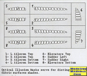 The instructions state that the kit's control surfaces are missing ribs and recommends sanding them smooth prior to attaching these masks. I'm going to jump out here and state that were I using these, I'd remove the small areas and then place the outline mask in place prior to misting on the darkened shade.
