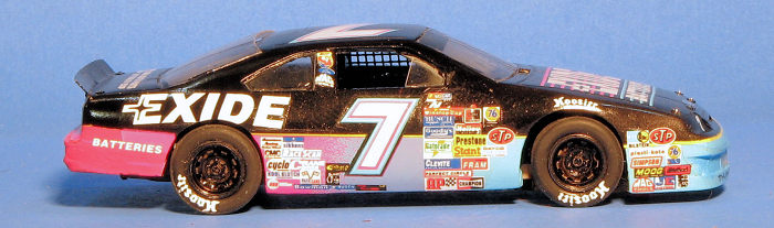 and painted them black. The sponsor decals were applied to the rubber tires. I also used my Dremel and cutting disc to shorten the axles so they'd fit.