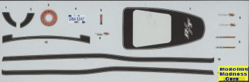 A 440 cubic inch engine is provided and it has an interesting feature in that if you leave off the heads, you can see the top of the pistons and if you leave off the valve covers you can seethe rocker arms. Of course almost all modelers will build a complete engine. The transmission is molded into the block. In addition to all the engine accessories, there are stock exhaust headers. A decal is provided for the top of the air cleaner.