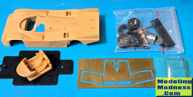 The resin casting on this one is superb, right down to the molded on seat harness. Generally one will have to remove some level of flash from the window areas. This one had a minimal amount compared to other kits that I have. Resin is also used for the headlights and while it is supposed to be clear, it has yellowed quite a bit over the years. The same can be said for the window piece though it is not as far along as some that I have seen.