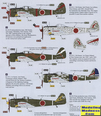 This sheet has a number of early Ki-43-Is on it with the first one being an 11th Sentai, 2nd Chutai plane at Lae in mid 1943. This one is overall dark green upper and silver underside with a red forward cowling.