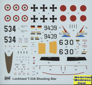 The kit offers three decal options. The box art plane is from the Sotai Headquarters Squadron. It is in aluminum with orange and black tip tanks. An Italian version from Camerai is in the same scheme. Finally, in a camouflage scheme of dark grey and dark green over light grey is a plane from Erding. Decals are very nicely printed by Techmod and include nose anti-glare panel and wing walk panels. Kit instructions are typical Sword and offer generic color references.