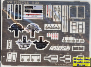 The T-33 requires new fuselage halves, new wing tip tanks, new interior and canopy. Sword does the multi-media approach with resin for the seats, wheel wells and a few other bits. Photo etch is used for most of the interior details, including instrument panels and for landing gear retraction struts, speed brake detailing, and oleo scissors to name a few. The etched set is in color, which is very nice.