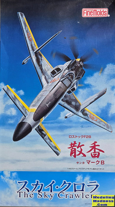 All of the aircraft look like very modern WWII types that are vaguely based on planes with which many may be familiar. There are at least eight identified aircraft types in the film. Two have been kitted by Bandai in 172 soon after the movie was released. This one is the Sanka Mk.B, the standard single seat fighter of the Rostock Iron Works. It is quite reminiscent of the Kyushu J7W Shinden.