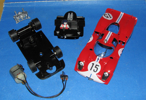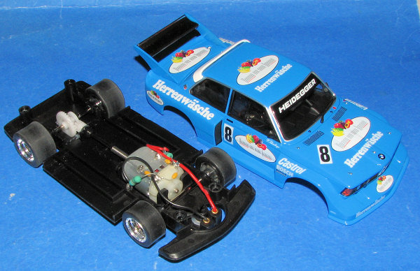 You'll also notice that this car does not have a long solid front axle as with the BMW before. Many people do not like these 'stub' axles and will replace it with a regular one. I have found it not to be a problem. One thing I have found with these kits is that if you replace the motor wires that run to the guide just as they are done when one opens the kit, the car will run backwards on the track. I'm not even sure why it is factory wired as one has to remove the wires in order to put in the guide.