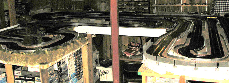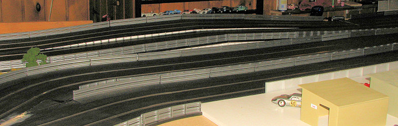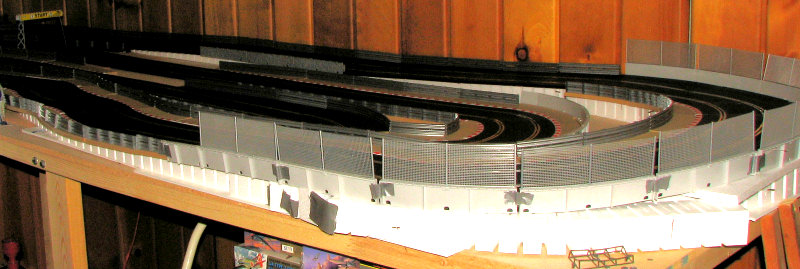 So far, these are just temporary as I'm making room for the final section of 4x8 (which will be suitably cut down to fit). This will not happen soon, but half the fun of these tracks is the anticipation and planning. It will end up being an L shaped piece and will bring final track length into the 165 foot range and probably have lap times closer to 20 seconds on the average. Currently with 140 feet, the really fast cars are in the high 13s with the average more into the 15 second range.