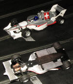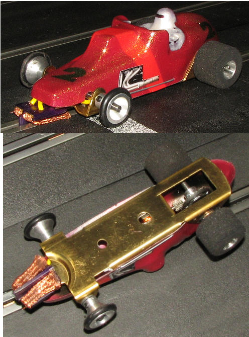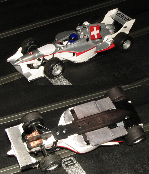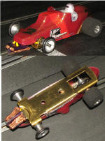 The Europlastic are Scalextric Porsche 911s and Scalextric A1 GP racers. Basically we can change to a deeper guide for the wood tracks, add weight and change tires. We've all done just that as you can see from the pics below.
