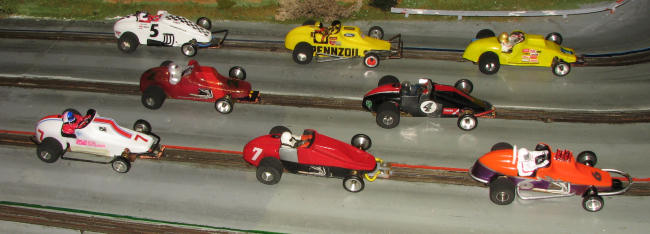We also were running on one plastic four lane track, but again, it is now put up to remodel the area. An infusion of new members should garner a new plastic track or two. Hosting an event means having about double the space of the track for 'pit' stations for the various entrants to work on cars. I don't have the space so am not hosting races in this series. Besides, I'd rather have a long two lane track than a short 4 lane version as I'm the one spending the bulk of the time on it.