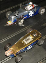 The Sprint plus are 1/32 scale and run a variety of motors. The vintage modifieds run either an open or a closed top body. These two cars come as disassembled kits and require being put together. The modified require the builder to construct a front axle housing. These cars are quite heavy and so do not accelerate well, something that is further enhanced by the larger electric motor they use. Rules are quite strict on the modifieds, even to what gear ratios can be used. This is not a limitation on the sprint plus cars and they are wickedly fast, to the point of being quite squirrelly.
